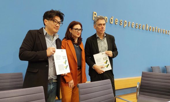 Berlin 19.03.2026 – Wirtschaftsministerin Katarina Reiche, Verteidigungsminister Boris Pistorius und der Vorsitzende des Bundesverbands der Deutschen Industrie,(BDI) Peter Leibinger, gaben...