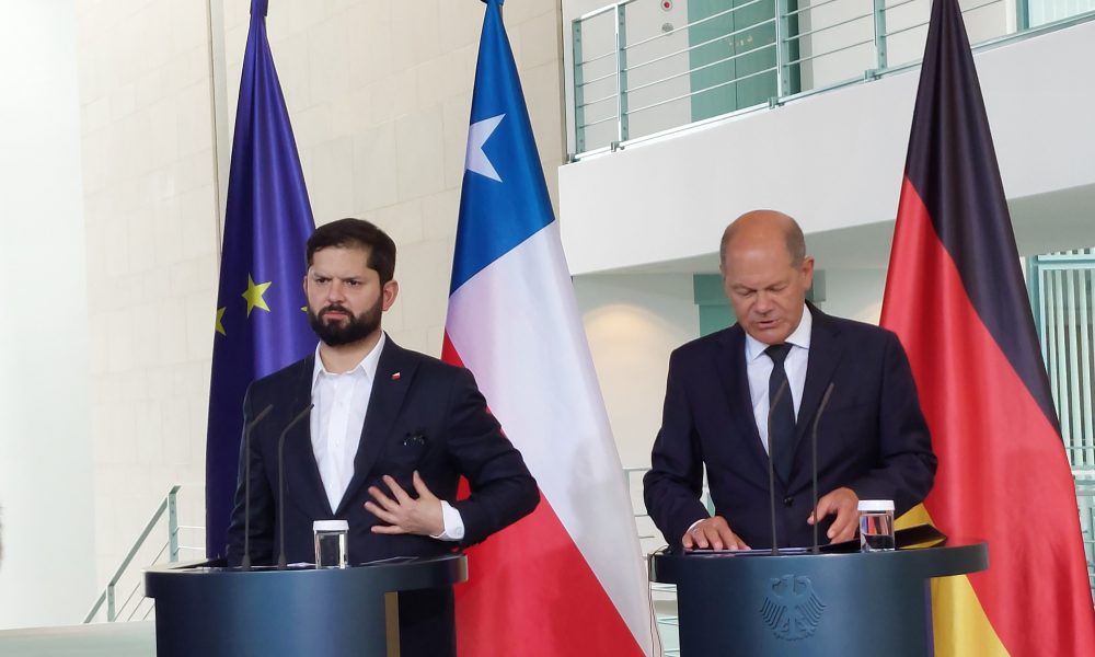 Betlin 10.6. 2024 PWO Bundeskanzler Olalf scholz lz und der chilenische Präsident Gabriel Boric Front bezeichneten die Beziehungen ihrer Länder als gut, während Chiles Riles den...