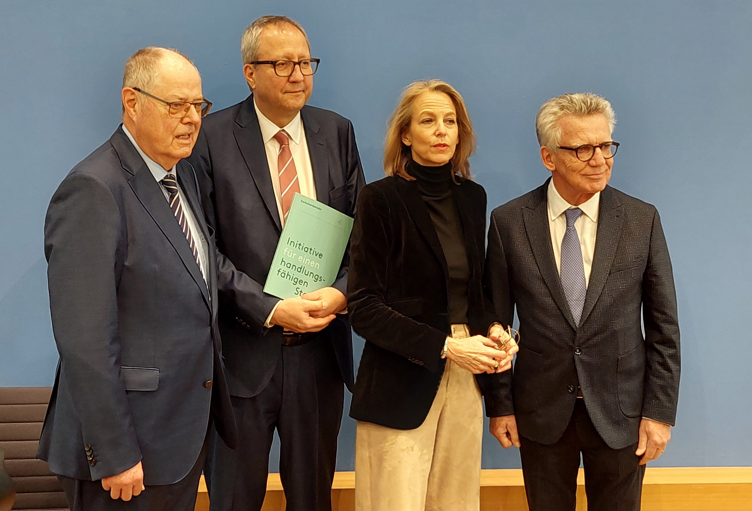 Die Initiative für einen handlungsfähigen Staat verfolgt das Ziel, die Effizienz und Bürgernähe der deutschen Verwaltung durch umfassende Reformen zu stärken. Gegründet von der Medienmanagerin und Aufsichtsrätin Julia Jäkel, den früheren Bundesministern Peer Steinbrück und Thomas de Maizière sowie dem ehemaligen Präsidenten des Bundesverfassungsgerichts Andreas Voßkuhle, sollen die Expertinnen und Experten gemeinsam konkrete Ansätze erarbeiten, wie staatliche Strukturen in Deutschland zukunftsfähig gestaltet werden können. Bundespräsident Frank-Walter Steinmeier hat für das Vorhaben die Schirmherrschaft übernommen. Die vier Initiatorinnen und Initiatoren werden dabei von einer Gruppe von über 50 erfahrenen Persönlichkeiten aus Politik, Wissenschaft und Zivilgesellschaft unterstützt. Außerdem sollen Dialogformate mit Studierenden und Alumni der Hertie School und Bucerius Law School, insbesondere jüngeren Praktiker aus dem öffentlichen Sektor, den Prozess flankieren.