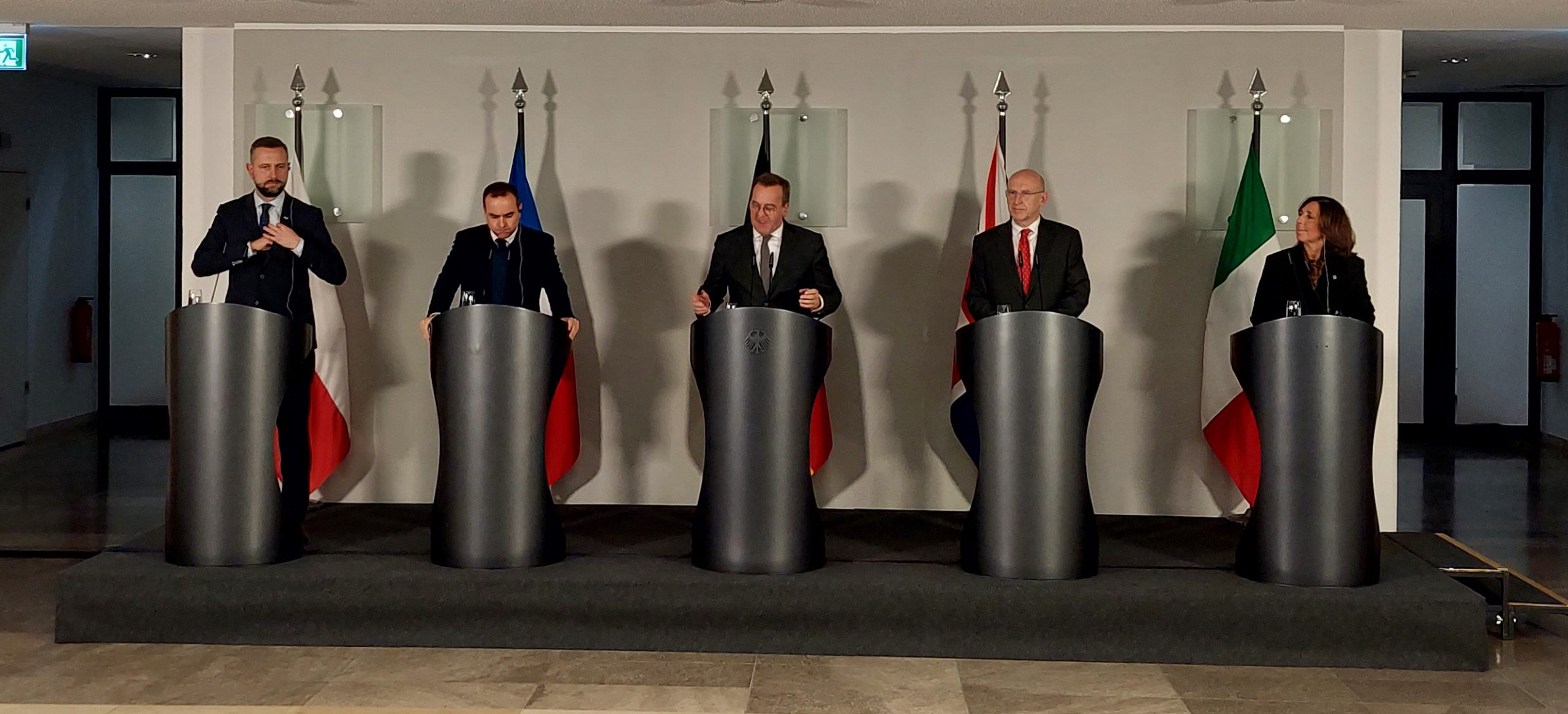 Der deutsche Verteidigungsminister Boris Pistorius und seine Amtskollegen, die Verteidigungsminister Frankreichs, Großbritanniens, Italiens und Polens, gaben kurz nach ihrem Treffen in Berlin ihre Bestätigung bekannt, ihrer Unterstützung für die Verteidigung der Ukraine bei der Abwehr des russischen Angriffs, da die Verteidigung Kiews auch eine Verteidigung der Demokratie und Freiheit in Europa ist.