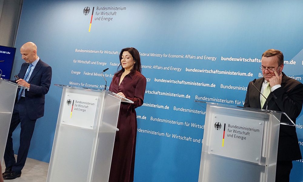 Berlin 19.03.2026 – Wirtschaftsministerin Katarina Reiche, Verteidigungsminister Boris Pistorius und der Vorsitzende des Bundesverbands der Deutschen Industrie,(BDI) Peter Leibinger, gaben nach ihrem Treffen eine enge Zusammenarbeit...