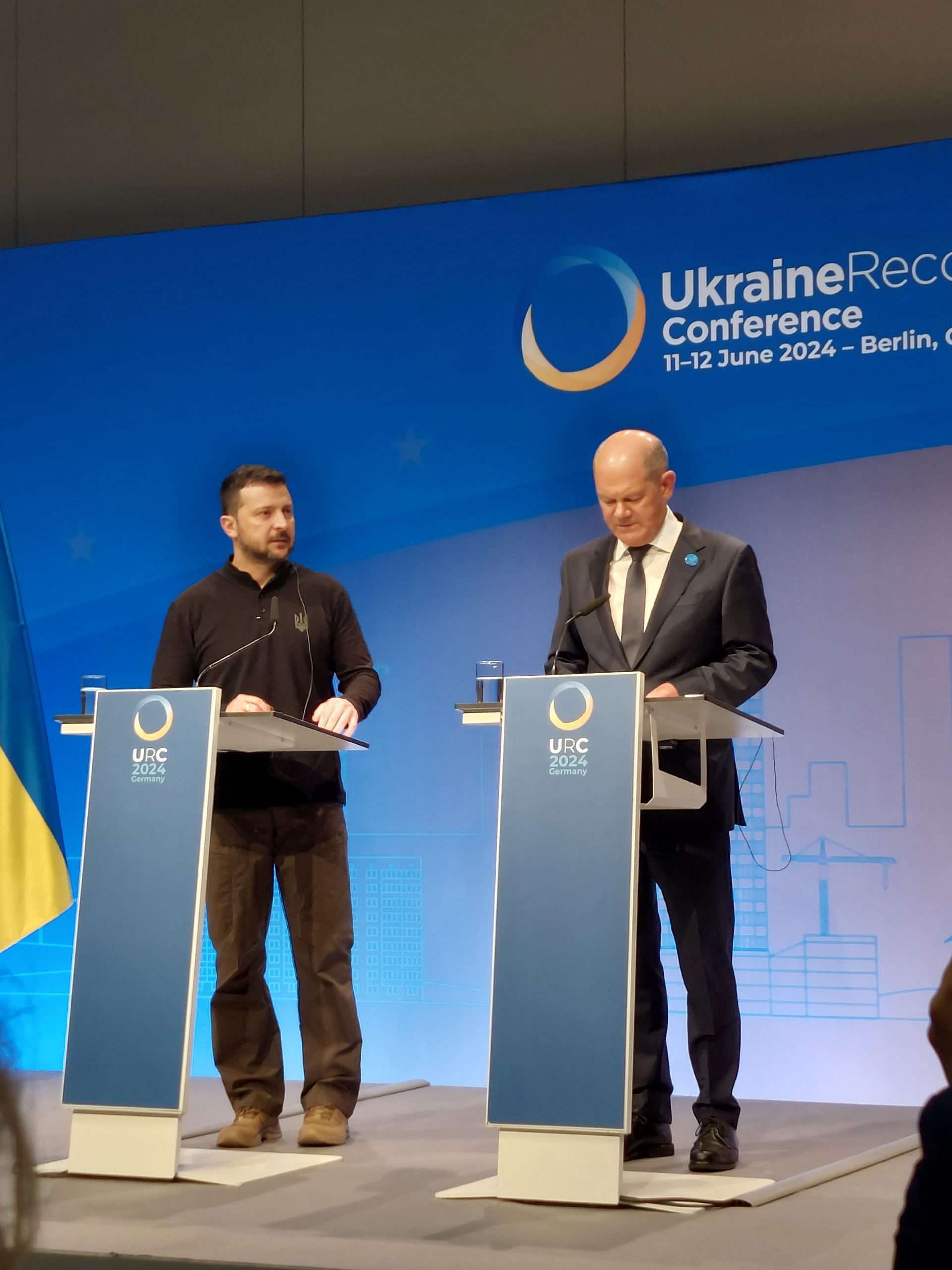 Bundeskanzler Olaf Scholz und der ukrainische Präsident Wolodymyr Selenskyj brachten ihre Zufriedenheit darüber zum Ausdruck, dass die Teilnehmer der Konferenz zum Wiederaufbau der Ukraine ihre Solidarität mit der Ukraine bekundeten.